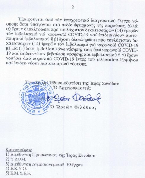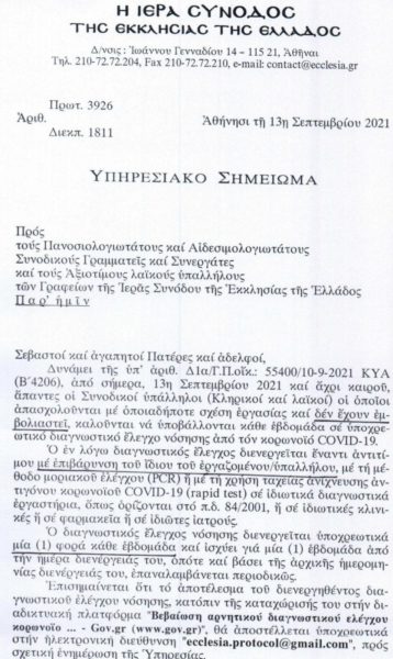 Στην εφαρμογή των νέων μέτρων που ισχύουν από χθες σχετικά με τους εμβολιασμένους και τους ανεμβολίαστους αναφέρεται με Εγκύκλιο σημείωμα της η Ιερά Σύνοδος της Εκκλησίας της Ελλάδος.