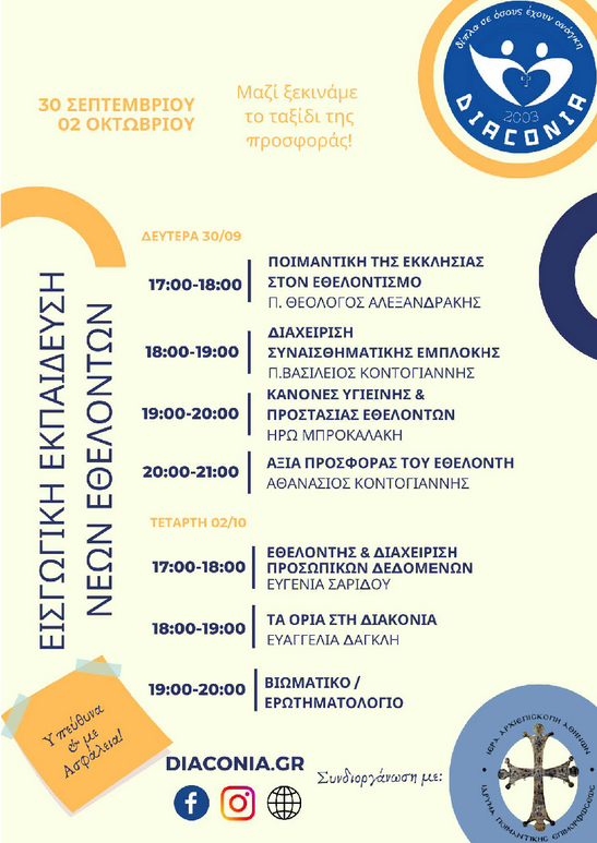 Ο Σύλλογος Εθελοντικής Διακονίας Ασθενών σε συνεργασία με το Ίδρυμα Ποιμαντικής Επιμόρφωσης (Ι.Π.Ε.) της Ιεράς Αρχιεπισκοπής Αθηνών (Ι.Α.Α.) πρόκειται να υλοποιήσει τη Δευτέρα 30 Σεπτεμβρίου 2024 και την Τετάρτη 2 Οκτωβρίου 2024 στο Πολιτιστικό Κέντρο της Ι.Α.Α. (Βασιλείου του Μεγάλου 15) εκπαίδευση νέων εθελοντών.