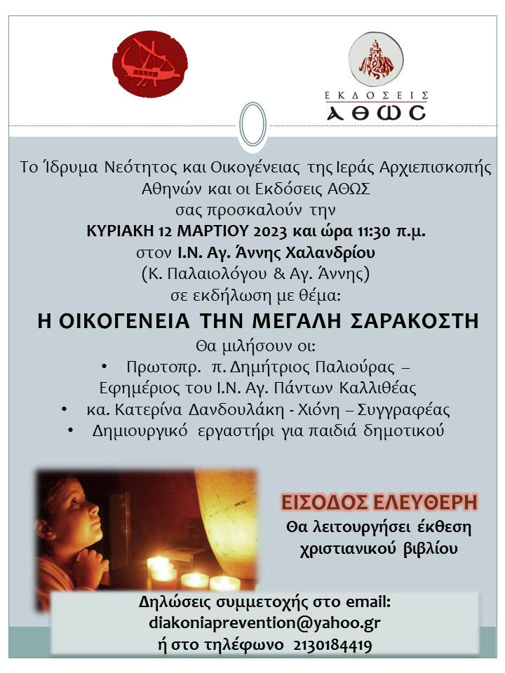 Το Ίδρυμα Νεότητας και Οικογένειας της Ιεράς Αρχιεπισκοπής Αθηνών σε συνεργασία με τον Ιερό Ναό Αγίας Άννης Χαλανδρίου έχει σχεδιάσει εκδήλωση αφιερωμένη στην οικογένεια με θέμα: «Η ΟΙΚΟΓΕΝΕΙΑ ΤΗΝ ΜΕΓΑΛΗ ΣΑΡΑΚΟΣΤΗ».