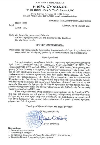 Διαβάστε αναλυτικά το υπ’ αριθ. 1072 Εγκύκλιο Σημείωμα της Ιεράς Συνόδου της Εκκλησίας της Ελλάδος (8 Ιουνίου 2021), περί της δέουσας διενέργειας διαγνωστικών ελέγχων (self test) εκ μέρους των ιερεών, του βοηθητικού προσωπικού των ιερών ναών και του προσωπικού των πάσης φύσεως εκκλησιαστικών νομικών προσώπων.