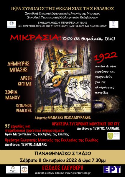 Η Ιερά Σύνοδος της Εκκλησίας της Ελλάδος συνδιοργανώνει Επετειακή Εκδήλωση για τα 100 χρόνια από τη Μικρασιατική Καταστροφή στο Παναθηναϊκό Στάδιο, το Σάββατο 8 Οκτωβρίου 2022 και ώρα 7.30 μ.μ., με την Περιφέρεια Αττικής, καθώς και με τη στήριξη του Υπουργείου Πολιτισμού και Αθλητισμού και της Αστικής Μη Κερδοσκοπικής Εταιρείας Πολιτιστικού και Κοινωφελούς Έργου «ΑΙΓΕΑΣ ΑΜΚΕ» της οικογένειας Αθανασίου και Μαρίνας Μαρτίνου.