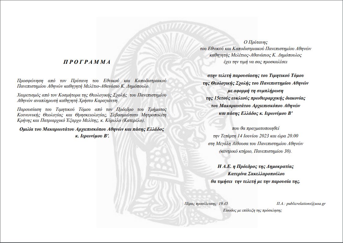 Παρουσία της Προέδρου της Ελληνικής Δημοκρατίας κ. Κατερίνας Σακελλαροπούλου θα γίνει παρουσίαση το απόγευμα της Τετάρτη 14 Ιουνίου του Τιμητικού Τόμου της Θεολογικής Σχολής του Πανεπιστημίου Αθηνών με αφορμή τη συμπλήρωση της 15ετούς πρωθιεραρχικής διακονίας του Αρχιεπισκόπου Αθηνών και πάσης Ελλάδος κ.κ. Ιερωνύμου Βʹ.