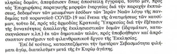 Συγκεκριμένα, στην επιστολή αναφέρεται πως η Ιερά Σύνοδος θα αποστείλει έγγραφα α) προς τις επιχειρήσεις παραγωγής μορφών ενέργειας για την παροχή έκπτωσης δεδομένων των μειωμένων εσόδων των ναών λόγω κορωνοϊού και β) προς τις κρατικές υπηρεσίες για την εξέταση δυνατότητας απαλλαγής των εκκλησιαστικών δομών από τα δημοτικά τέλη ένεκα της ανατίμησης των καυσίμων.