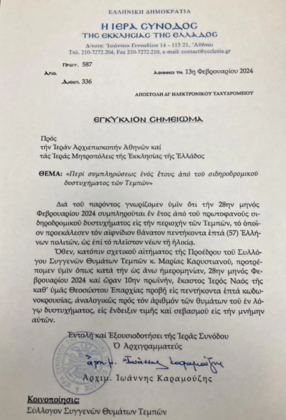 Διά τοῦ παρόντος γνωρίζομεν ὑμῖν ὅτι τήν 28ην μηνός Φεβρουαρίου 2024 συμπληροῦται ἕν ἔτος ἀπό τοῦ πρωτοφανοῦς σιδηροδρομικοῦ δυστυχήματος εἰς τήν περιοχήν τῶν Τεμπῶν, τό ὁποῖον προεκάλεσεν τόν αἰφνίδιον θάνατον πεντήκοντα ἑπτά (57) Ἑλλήνων πολιτῶν, ὡς ἐπί τό πλεῖστον νέων τῇ ἡλικίᾳ.