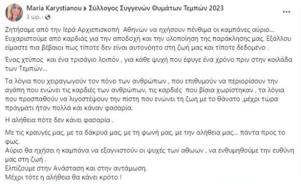 «Ζητήσαμε από την Ιερά Αρχιεπισκοπή Αθηνών να ηχήσουν πένθιμα οι καμπάνες αύριο… Ευχαριστούμε από καρδιάς για την αποδοχή και την υλοποίηση της παράκλησης μας. Εξάλλου είμαστε πια βέβαιοι πως τίποτε δεν είναι αυτονόητο στη ζωή μας και τίποτε δεδομένο.