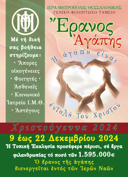 Στο πλαίσιο αυτό, και στο κλίμα αλληλεγγύης που δημιουργεί σε όλους μας το μήνυμα της Γέννησης του Κυρίου, οι Ιερές Μητροπόλεις και οι ενορίες εντείνουν το φιλανθρωπικό έργο διεξάγοντας Εράνους Αγάπης οι οποίες είτε βρίσκονται σε εξέλιξη είτε ολοκληρώθηκαν.