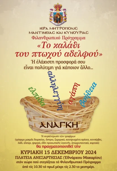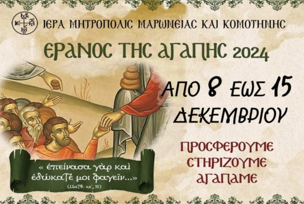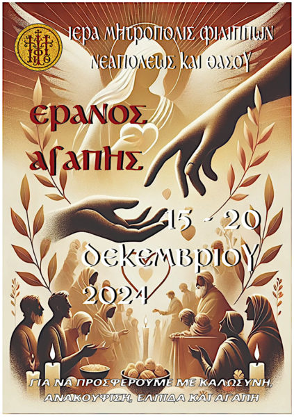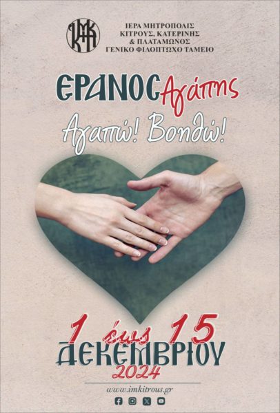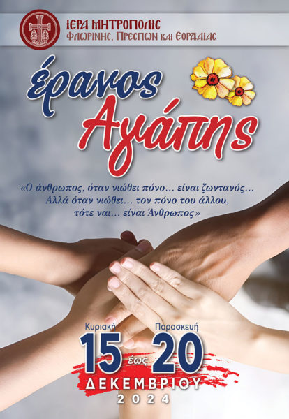 «Kατά τόν Ἔρανο Ἀγάπης 2024, πού ἤδη διεξάγει ἡ καθ’ ἡμᾶς Ἱερά Μητρόπολη ἀπό 21ης Νοεμβρίου ἐ.ἔ. ἕως 8ης Ἰανουαρίου τοῦ νέου ἔτους 2025, ἄς συνειδητοποιήσομε ὅτι τά λίγα ἤ πολλά ἀγαθά πού ἔχουμε εἶναι δῶρα πού ὁ Θεός μᾶς δίνει μέσα ἀπό τήν ζωή, γιά νά «κοινωνοῦμε» μέ Ἐκεῖνον καί τούς συνανθρώπους μας. Ἄς ἐμπιστευθοῦμε τόν Θεό καί ἄς μάθουμε νά μοιραζόμαστε μέ τόν πλησίον μας, ἀφοῦ πλησίον δέν εἶναι μόνο ὁ κοντινός, ὁ δικός μας ἄνθρωπος, ἀλλά ὁ κάθε ἄνθρωπος πού ἔχει τήν ἀνάγκη μας.»