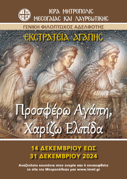 Η Ιερά Μητρόπολη Μεσογαίας και Λαυρεωτικής επαναλαμβάνει τον καθιερωμένο «ΕΡΑΝΟ ΤΗΣ ΑΓΑΠΗΣ», και προτρέπει όλους να ανοίξουμε την καρδιά μας και να συμβάλουμε το κατά δύναμιν σε αυτόν τον χριστουγεννιάτικο συναγερμό της αλληλεγγύης και της προσφοράς. Οι διακονητές του ΕΡΑΝΟΥ που θα περιέλθουν κάθε γωνιά της Μητροπόλεως από τις 14 έως τις 31 Δεκεμβρίου, θα χτυπήσουν και την δική μας πόρτα. Η διακριτική παρουσία τους είναι η επίσκεψη του Χριστού στο σπίτι και στη ζωή μας. Όποιος επιθυμεί, μπορεί να καταθέσει τον οβολό της αγάπης του και στους λογαριασμούς της Μητροπόλεώς, που μπορείτε να τους βρείτε είτε αναρτημένους στην ιστοσελίδα της Μητροπόλεως είτε από τους ιερείς.