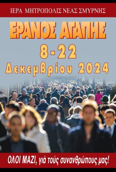 Ο Έρανος Αγάπης της Ιεράς Μητροπόλεως Νέας Σμύρνης, ολοκληρώνεται σήμερα Κυριακή, 22 Δεκεμβρίου 2024. Ενοριακά συνεργεία εθελοντριών κυριών πραγματοποιούν επισκέψεις σε σπίτια και καταστήματα και απευθύνουν κάλεσμα στήριξη στην ευλογημένη αυτή προσπάθεια.