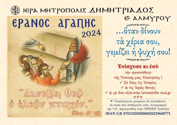 Για ακόμα μία χρονιά, η Ιερά Μητρόπολη Δημητριάδος και Αλμυρού πραγματοποιεί τον Έρανο Αγάπης, την περίοδο των επικείμενων εορτών, για την ενίσχυση του ποικίλου κοινωνικού και φιλανθρωπικού της έργου και την στήριξη των εμπερίστατων συμπολιτών μας. Στο διάστημα που απομένει έως τις εορτές των Χριστουγέννων, η Τοπική Εκκλησία διεξάγει σε όλες τις ενορίες τον Έρανο Αγάπης. Ομάδες εθελοντριών κυριών επισκέπτονται τις οικίες και τα καταστήματα, απευθύνοντας παράκληση στον λαό να συμμετάσχει, προσφέροντας από το υστέρημά του. Η οικονομική συμβολή θα δώσει την δυνατότητα στην Μητρόπολη να καλύψει τις ανάγκες των εμπερίστατων αδελφών μας την περίοδο των Χριστουγέννων και να συνεχίσει το πολύπλευρο φιλανθρωπικό της έργο. Χρόνια τώρα η Τοπική Εκκλησία προσφέρει πολλές ευκαιρίες, ώστε η αγάπη προς τον φτωχό, τον ασθενή, τον άστεγο και τον εγκαταλελειμμένο να επαληθεύει την πίστη και την αγάπη όλων προς τον ίδιο Θεό.