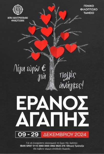 «Λίγα ευρώ € για πολλές ανάγκες!». Αυτό είναι το σύνθημά της Ιεράς Μητροπόλεως Φθιώτιδος για τον φετινό Έρανο της Αγάπης ο οποίος θα διαρκέσει έως τις 29 Δεκεμβρίου 2024.