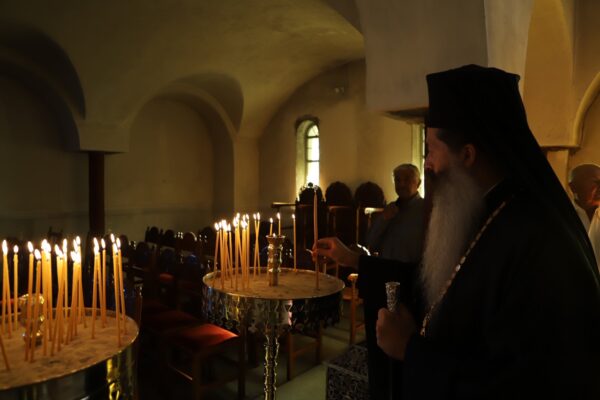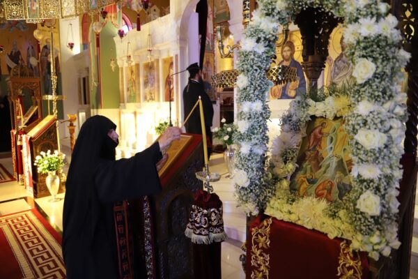 Στον εσπερινό χοροστάτησε ο Επίσκοπος Θεσπιών Συμεών, ο οποίος έτυχε θερμής υποδοχής από την ηγουμένη Στυλιανή και την αδελφότητα της μονής.