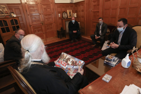 Ο κ. Δεσύλλας προσέφερε στον Αρχιεπίσκοπο την επετειακή σειρά επιτραπέζιων παιχνιδιών για το 1821 της εταιρείας, τα οποία τελούν υπό την αιγίδα του Πολεμικού Μουσείου.