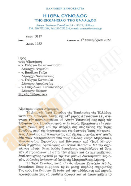 Στην πρόσφατη (24η Αυγούστου) συνεδρίαση της Διαρκούς Ιεράς Συνόδου συζητήθηκε-αναγνώσθηκε η (από 20ης Ιουνίου) επιστολή των δημάρχων Αγρινίου, Ναυπακτίας, Θέρμου και Αμφιλοχίας προς τον πρωθυπουργό Κυριάκο Μητσοτάκη με την οποία τάσσονται επι των προτάσεων της εκκλησίας για διχοτόμηση της Μητροπόλεως Αιτωλίας και Ακαρνανίας και αλλαγή ορίων της Μητρόπολης που εδρεύει στη Ναύπακτο.