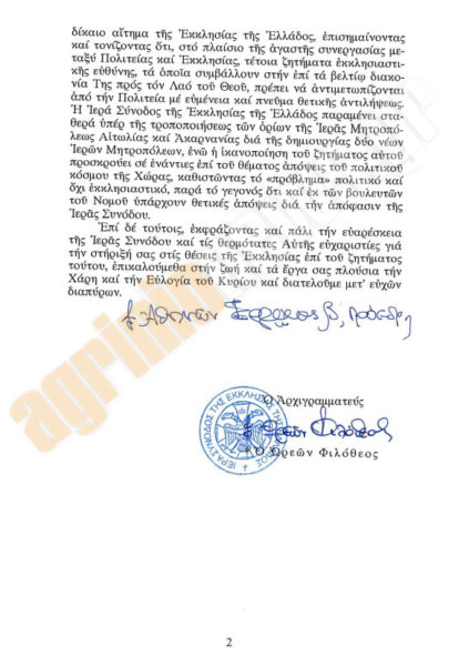 «Η Ιερά Σύνοδος της Εκκλησίας της Ελλάδος παραμένει σταθερά υπέρ της τροποποιήσεως των ορίων της Ιεράς Μητροπόλεως Αιτωλίας και Ακαρνανίας διά της δημιουργίας δύο νέων Ιερών Μητροπόλεων, ενώ η ικανοποίηση του ζητήματος αυτού προσκρούει σε ενάντιες επί του θέματος απόψεις του πολιτικού κόσμου της χώρας, καθιστώντας το «πρόβλημα» πολιτικό και όχι εκκλησιαστικό, παρά το γεγονός ότι και εκ των βουλευτών του νομού υπάρχουν θετικές απόψεις διά την απόφασιν της Ιεράς Συνόδου», σημειώνει χαρακτηριστικά.