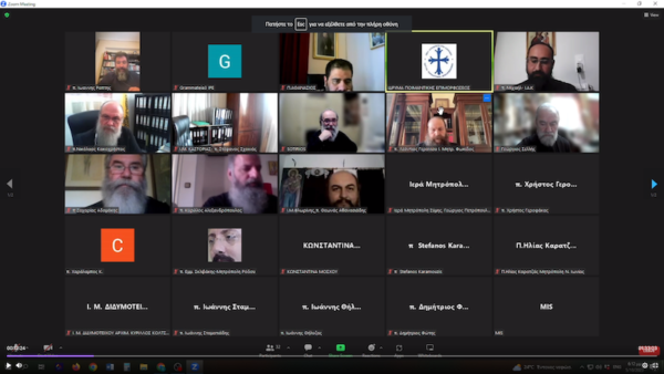 Επίσης μέσω της πλατφόρμας Zoom, στην οποία συμμετείχαν 107 συνεργάτες και συντονιστές του Ι.Π.Ε., απηύθυναν χαιρετισμό εκ μέρους του Σεβασμιωτάτου Αρχιεπισκόπου Κρήτης κ. Ευγένιου Β’ ο Αιδεσ. Πρωτοπρ. Μιχαήλ Παπαθεοχάρης και εκ του ΕΣΚΕΚ ο Αιδεσ. Πρωτοπρ. Ζαχαρίας Αδαμάκης. Τέλος εκ μέρους των Συντονιστών των Ιερών Μητροπόλεων ευχαριστίες απηύθυναν ο Συντονιστής της Ιεράς Μητροπόλεως Διδυμοτείχου, Ορεστιάδος και Σουφλίου ο Πανος. Αρχιμ. Κύριλλος Κολτσίδης και ο Γενικός Αρχιερατικός Επίτροπος της Νήσου Τήνου Αιδες. Πρωτοπρ. Γεώργιος Φανερός.