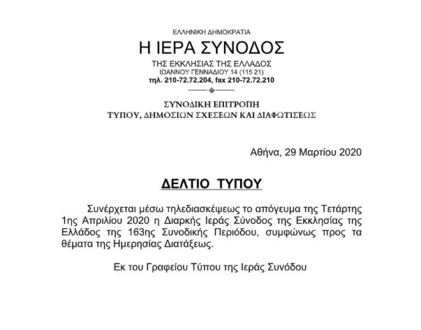 Συνέρχεται, βάσει του επισήμου δελτίου τύπου, μέσω τηλεδιασκέψεως, κατά το απόγευμα της Τετάρτης 1ης Απριλίου 2020, η Διαρκής Ιεράς Σύνοδος της Εκκλησίας της Ελλάδος της 163ης Συνοδικής Περιόδου, συμφώνως προς τα θέματα της Ημερησίας Διατάξεως, όπως ήδη απο εχθές σας είχε ενημερώσει ΑΠΟΚΛΕΙΣΤΙΚΑ το Πρακτορείο “ΟΡΘΟΔΟΞΙΑ”.