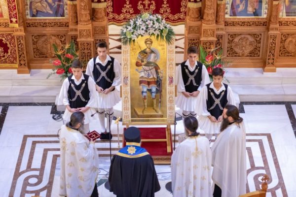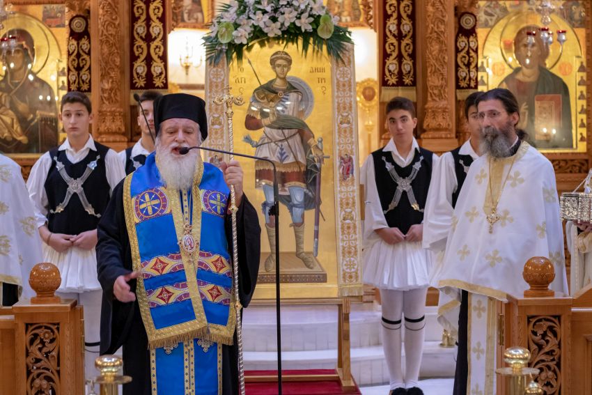 Προ της απολύσεως της ιεράς Ακολουθίας, όλοι οι πιστοί με ιδιαίτερη συγκίνηση έψαλαν το κοντάκιο “Τη Υπερμάχω”, προς τιμήν της Υπεραγίας Θεοτόκου και τον Εθνικό μας Ύμνο.