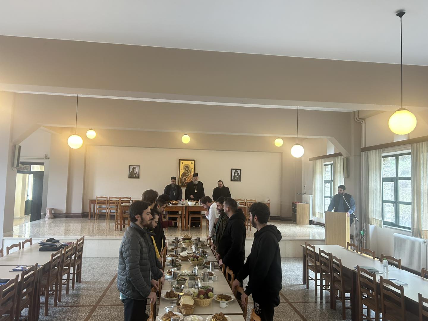 Κατά την επίσκεψή του ευλόγησε επίσης και παρακάθισε στη μεσημβρινή τράπεζα της Σχολής, έχοντας την ευκαιρία για περαιτέρω επικοινωνία με τους Ιεροσπουδαστές.