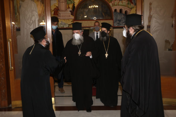 Τον Σεβασμιώτατο συνόδευαν οι Μητροπολίτες Γορτύνης και Αρκαδίας Μακάριος, Κυδωνίας και Αποκορώνου Δαμασκηνός, Ιεραπύτνης και Σητείας Κύριλλος, ο Αρχιγραμματέας της Ιεράς Επαρχιακής Συνόδου Κρήτης, Επίσκοπος Κνωσού κ. Πρόδρομος, ενώ παρόντες ήταν ο Αρχιγραμματέας της Ιεράς Συνόδου της Εκκλησίας της Ελλάδος, Επίσκοπος Ωρεών κ. Φιλόθεος, ο Πρωτοσύγκελος της Αρχιεπισκοπής, Αρχιμανδρίτης Βαρνάβας Θεοχάρης, ο αναπληρωτής Γενικός Αρχιερατικός Επίτροπος, Αρχιμανδρίτης Ευγένιος Παντζαρίδης, ο Διευθυντής Προσωπικού της Αρχιεπισκοπής, π. Αναστάσιος Βλαβιανός, ο Πρακτικογράφος του Μητροπολιτικού Συμβουλίου, Αρχιμανδρίτης Δωρόθεος Κιούσης και ο Αρχιδιάκονος Ιωάννης Μπούτσης.