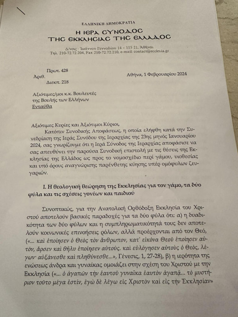 Επιστολή Ιεράς Συνόδου της Εκκλησίας της Ελλάδος προς βουλευτές: Το νομοσχέδιο για τα ομόφυλα ζευγάρια «καταργεί μητρότητα και πατρότητα» (ΦΩΤΟ)
