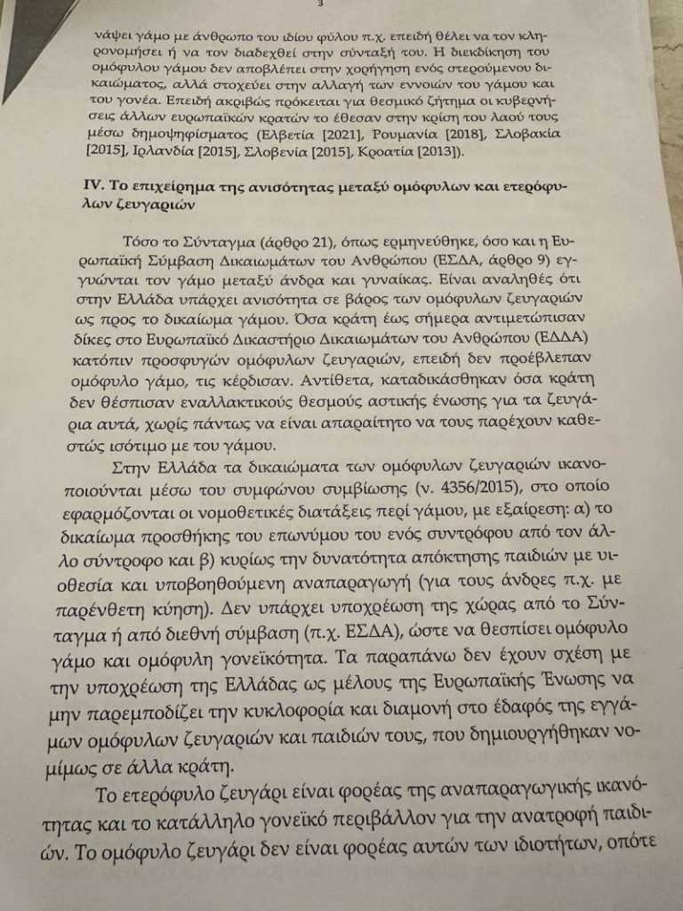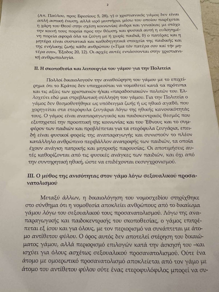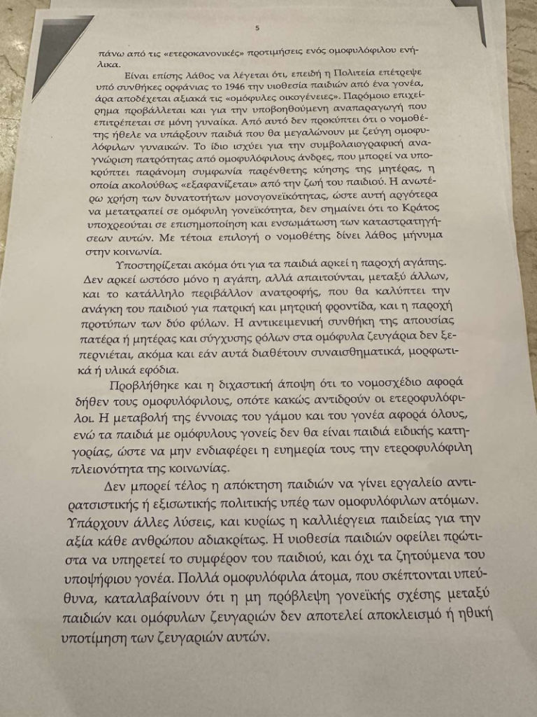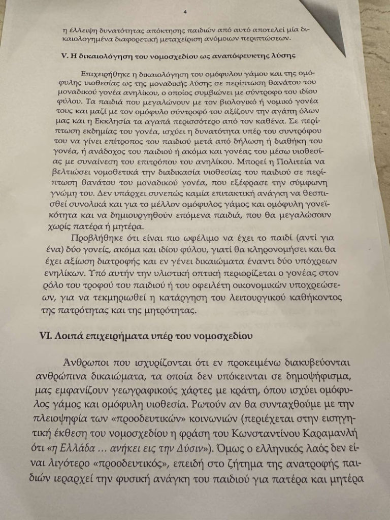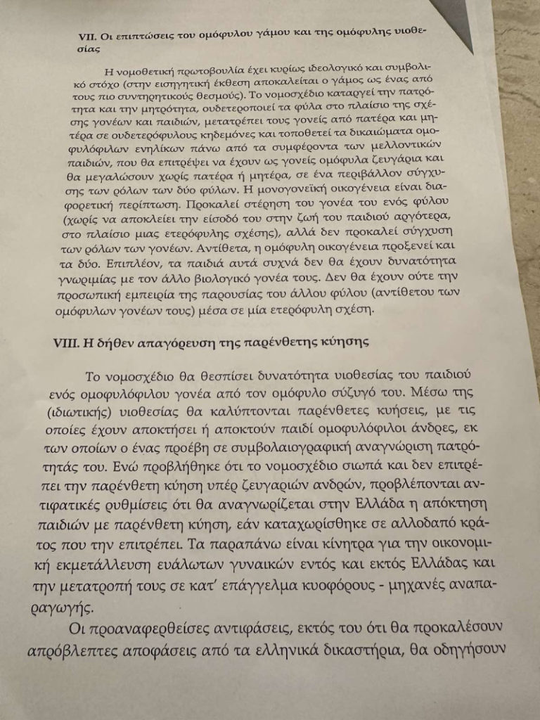 «Το νομοσχέδιο καταργεί την πατρότητα και τη μητρότητα, ουδετεροποιεί τα φύλα στο πλαίσιο της σχέσης γονέων και παιδιών, μετατρέπει τους γονείς από πατέρα και μητέρα σε ουδετερόφιλους κηδεμόνες και τοποθετεί τα δικαιώματα ομοφυλόφιλων ενηλίκων πάνω από τα συμφέροντα των μελλοντικών παιδιών, που θα επιτρέψει να έχουν ως γονείς ομόφυλα ζευγάρια και θα μεγαλώσουν χωρίς πατέρα ή μητέρα, σε ένα περιβάλλον σύγχυσης των ρόλων των δύο φύλων», επισημαίνεται μεταξύ άλλων.