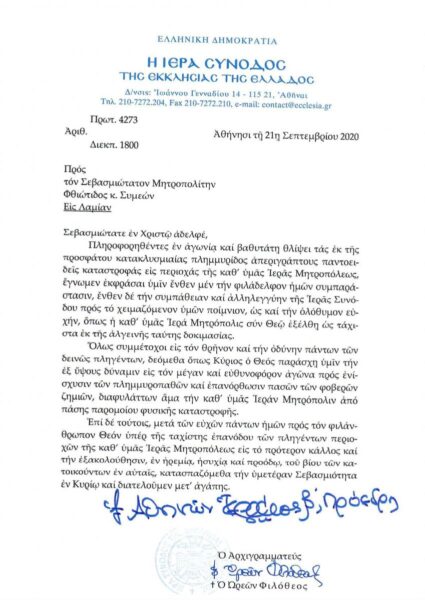 Επιστολή συμπαραστάσεως απέστειλε η Ιερά Συνόδος της Εκκλησίας της Ελλάδος προς τον Σεβασμιώτατο Μητροπολίτη Φθιώτιδος κ. Συμεών επ’ αφορμή του θρήνου και της οδύνης πάντων των δεινώς πληγέντων απο τις βιβλικές καταστροφές στις περιοχές της Ιεράς Μητροπόλεως. Η Ιερά Σύνοδος εκφράζει την ολόθυμον ευχήν της, ώστε να εξέλθει σύντομα ο τόπος απο την αλγεινή αυτή δοκιμασία.