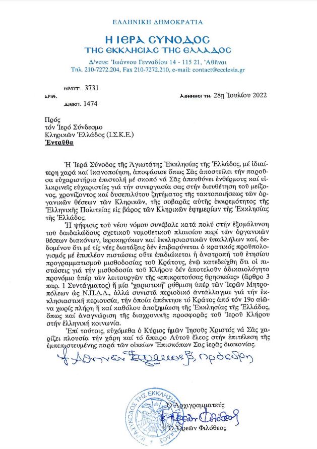 Η Ιερά Σύνοδος της Αγιωτάτης Εκκλησίας της Ελλάδος, με ιδιαίτερη χαρά και ικανοποίηση, αποφάσισε όπως Σας αποστείλει την παρούσα ευχαριστήρια επιστολή με σκοπό να Σας απευθύνει ένθερμους και ειλικρινείς ευχαριστίες για την συνεργασία σας στην διευθέτηση του μείζονος, χρονίζοντος και δυσεπιλύτου ζητήματος της τακτοποιήσεως των οργανικών θέσεων των Κληρικών, της σοβαράς αυτής εκκρεμότητος της Ελληνικής Πολιτείας εις βάρος των Κληρικών εφημερίων της Εκκλησίας της Ελλάδος.