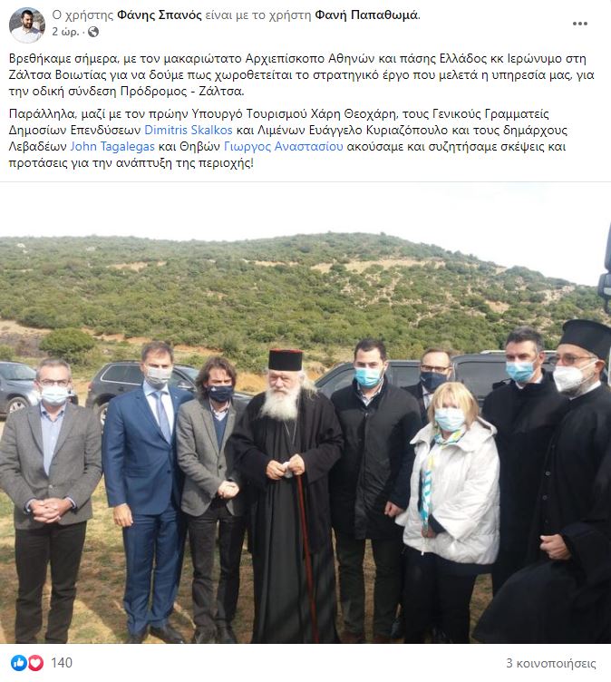 Στην Ζάλτσα Βοιωτίας βρέθηκε σήμερα, Τετάρτη 10 Νοεμβρίου 2021, ο Μακαριώτατος Αρχιεπίσκοπος Αθηνών και πάσης Ελλάδος κ.κ. Ιερώνυμος μαζί με τον Περιφερειάρχη Στερεάς Ελλάδας Φάνη Σπανό για να επιθεωρήσουν την χωροθέτηση του στρατηγικού έργου της οδικής σύνδεσης Πρόδρομος – Ζάλτσα.