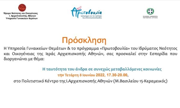 Η Υπηρεσία Γυναικείων θεμάτων και το πρόγραμμα “Πρωτοβουλία” για την πρόληψη της ενδοοικογενειακής βίας του Ιδρύματος Νεότητος και Οικογένειας διοργανώνει εσπερινή συζήτηση με θέμα : «Η ταυτότητα του άνδρα σε συνεχώς μεταβαλλόμενες κοινωνίες», την Τετάρτη 8 Ιουνίου.