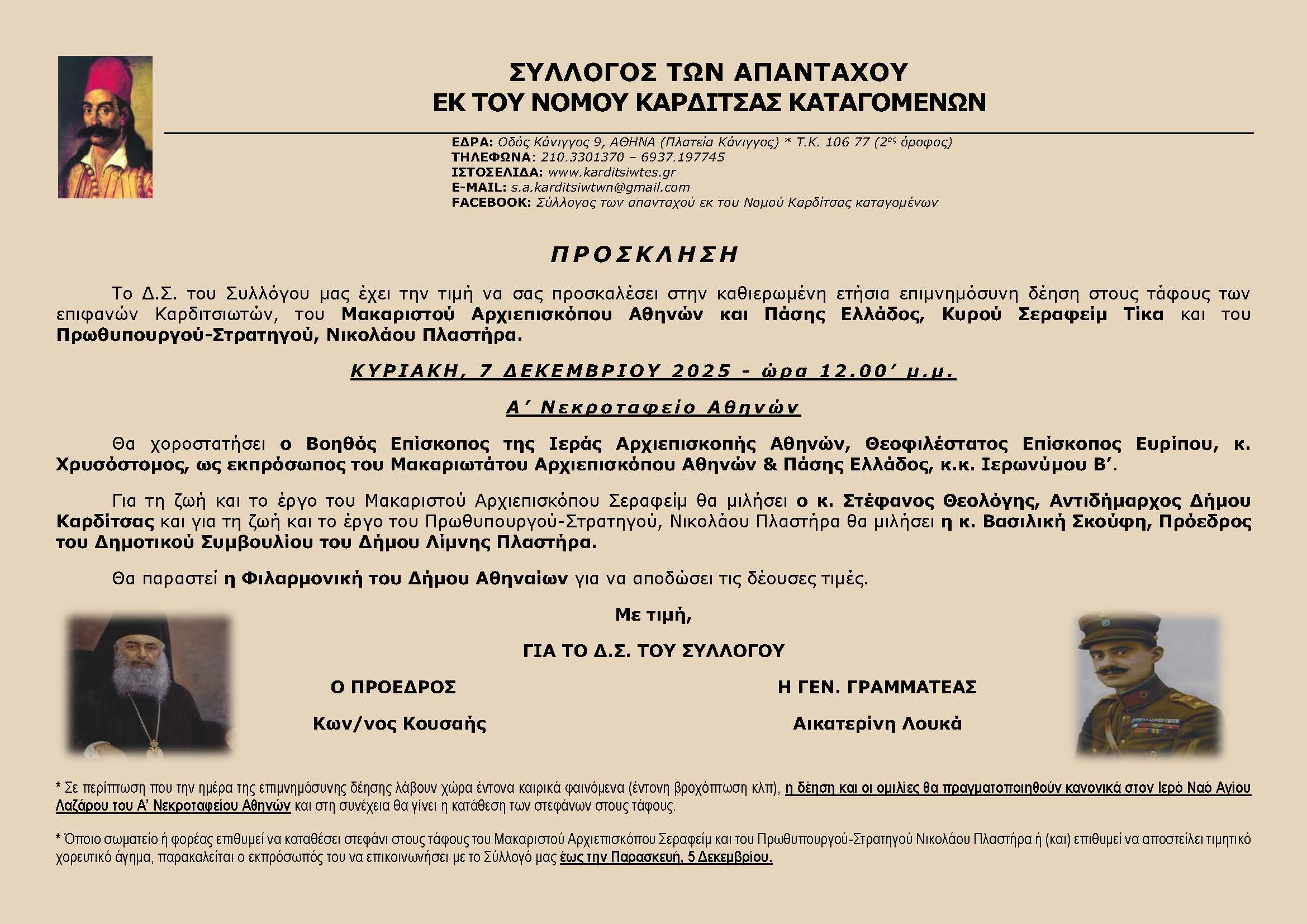 Ο Σύλλογος των απανταχού εκ του Νομού Καρδίτσας καταγομένων ανακοινώνει ότι την Κυριακή, 7 Δεκεμβρίου και ώρα 12.00’ μ.μ., στο Α’ Νεκροταφείο Αθηνών, θα πραγματοποιήσει με την δέουσα επισημότητα την καθιερωμένη ετήσια επιμνημόσυνη δέηση στους τάφους των επιφανών Καρδιτσιωτών, του Μακαριστού Αρχιεπισκόπου Αθηνών και Πάσης Ελλάδος κυρού Σεραφείμ Τίκα (γεννήθηκε στο Αρτεσιανό του Δήμου Καρδίτσας) και του Πρωθυπουργού και Στρατηγού, Νικολάου Πλαστήρα (γεννήθηκε στην πόλη της Καρδίτσας και καταγόταν από το Μορφοβούνι του Δήμου Λίμνης Πλαστήρα).