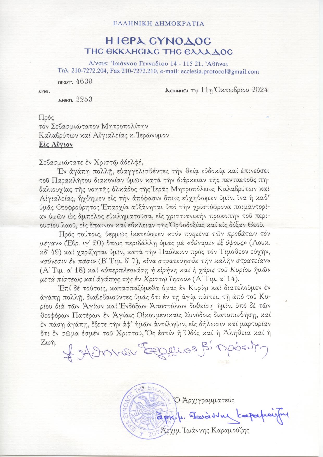 Πρός τόν Σεβασμιώτατον Μητροπολίτην Καλαβρύτων και Αἰγιαλείας κ. Ἱερώνυμον