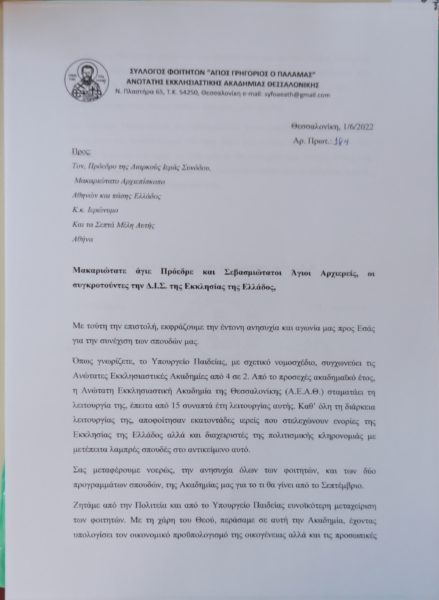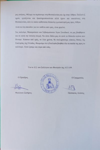“Σας καλούμε Μακαριώτατε και Σεβασμιώτατοι Άγιοι Συνοδικοί, να μας βοηθήσετε σε αυτή την ύστατη στιγμή. Να είστε δίπλα μας σε αυτόν τον ύστατο αγώνα που δίνουμε. Κάποιοι από εμάς, σε λίγα χρόνια, θα στελεχώσουμε κάποιες θέσεις της Εκκλησίας της Ελλάδος. Θεωρούμε ότι η Εκκλησία βοηθάει όλα τα παιδιά της προς το καλύτερο. Αυτό ζητάμε τώρα και από εσάς”, καταλήγει η Επιστολή του Συλλόγου Φοιτητών “Άγιος Γρηγόριος ο Παλαμάς” την οποία υπογράφουν εκ μέρους του Διοικητικού Συμβουλίου ο Πρόεδρος, κ. Σωτήριος Θεολόγου, και ο Γενικός Γραμματέας κ. Ανέστης Πατσιαλάς.