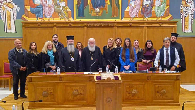 Στην συνέχεια, με την προτροπή και διαμεσολάβηση του ιδίου, η Καθηγήτρια μετά των φοιτητών της έγιναν δεκτοί από τον Μακαριώτατον Αρχιεπίσκοπον Αθηνών και πάσης Ελλάδος κ.κ. Ιερώνυμο -κατά το διάλειμμα της πρώτης ημέρας Συνεδριών της Διαρκούς Ιεράς Συνόδου- στην μεγάλη αίθουσα Συνάξεων της Ιεράς Συνόδου της Ιεραρχίας. Ο Προκαθήμενος της Εκκλησίας της Ελλάδος, περιστοιχούμενος από Συνοδικούς Αρχιερείς, χαιρέτισε ένα-ένα πρόσωπο, εκφράζοντας το ζωηρό ενδιαφέρον του και απηύθυνε πατρικές εόρτιες προσρήσεις και νουθεσίες, προτρεπόμενος τους φοιτητές να συνεχίσουν με ζήλο τον δρόμο της καταρτίσεως, λέγων χαρακτηριστικώς: “Με το καλό να μας φέρετε πολλές διατριβές”!