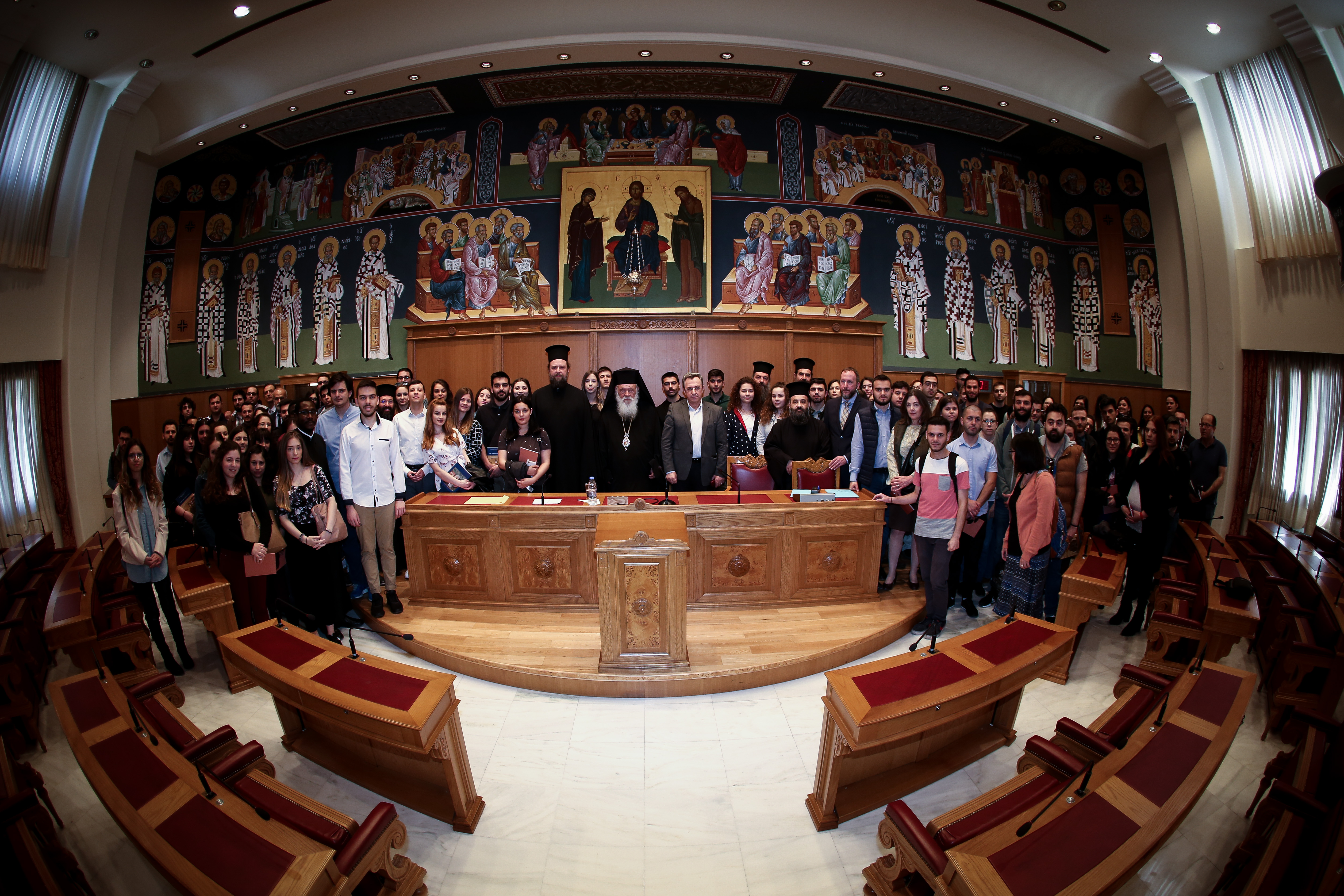 Στα πλαίσια του μαθήματος «Δογματική Β’», το οποίο διδάσκεται στο Τμήμα Θεολογίας της Θεολογικής Σχολής Αθηνών από τον Ελλογιμώτατο Καθηγητή κ. Σταύρο Γιαγκάζογλου, επισκέφθηκαν την Ιερά Σύνοδο της Εκκλησίας της Ελλάδος περί τους εκατό φοιτητές για να ενημερωθούν για την οργάνωση και διοίκηση της Ιεράς Συνόδου και της Εκκλησίας της Ελλάδος εν γένει. Τους φοιτητές υποδέχθηκε ο Μακαριώτατος Αρχιεπίσκοπος Αθηνών και πάσης Ελλάδος κ. Ιερώνυμος στην αίθουσα του Μεγάλου Συνοδικού.