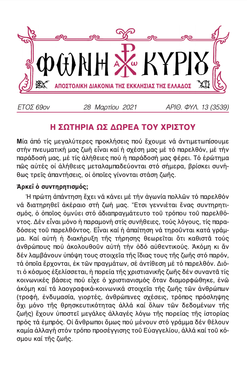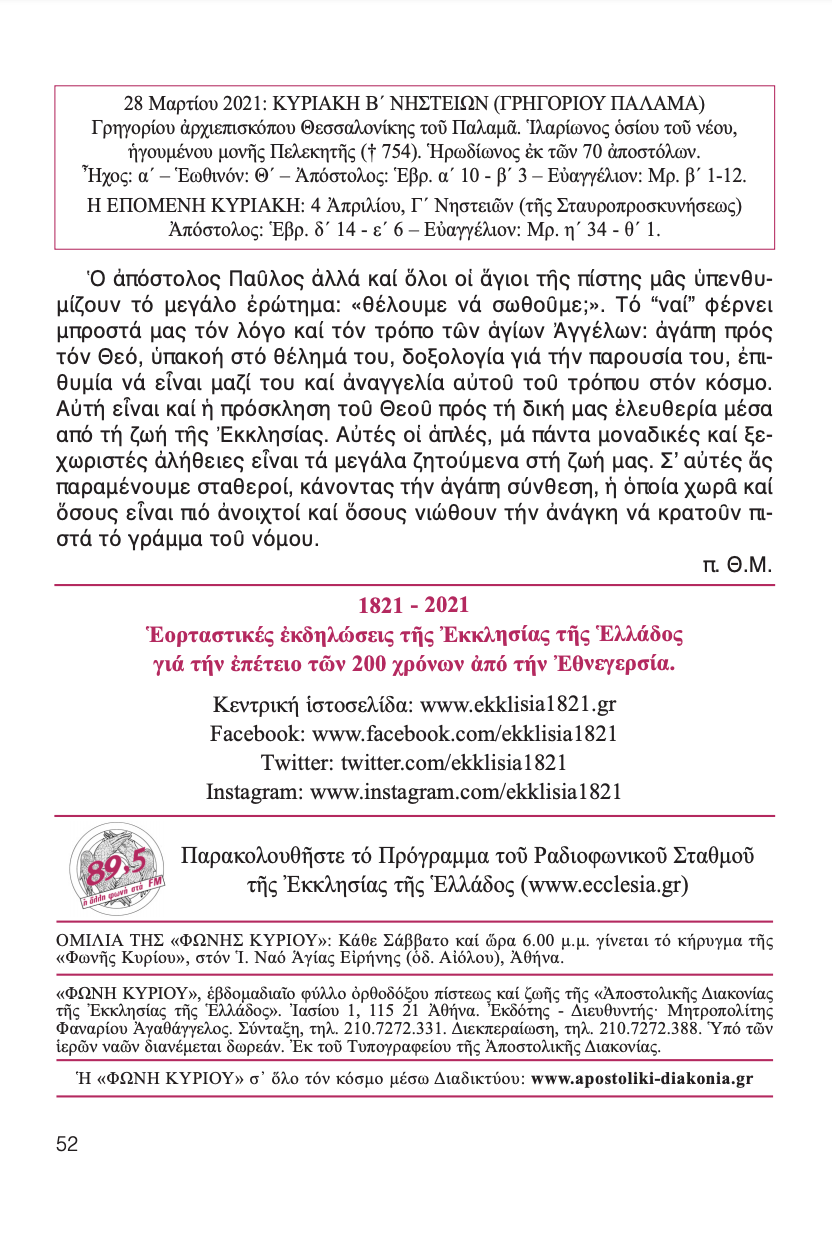 ΔΙΑΒΑΣΤΕ ΔΙΑΔΙΚΤΥΑΚΑ τη “Φωνή Κυρίου” της Αποστολικής Διακονίας της Εκκλησίας της Ελλάδος – ΚΥΡΙΑΚΗ Β’ ΝΗΣΤΕΙΩΝ (ΓΡΗΓΟΡΙΟΥ ΠΑΛΑΜΑ) – όπως αυτή διεμοιράσθη σε όλους τους ιερούς ναούς της ελληνικής επικράτειας, αλλά και του εξωτερικού, κατά την 28η Μαρτίου 2021.