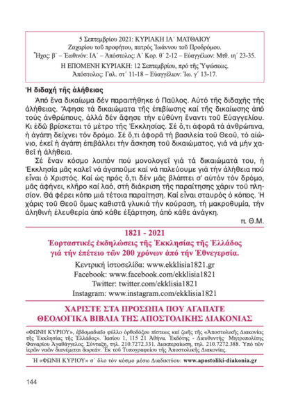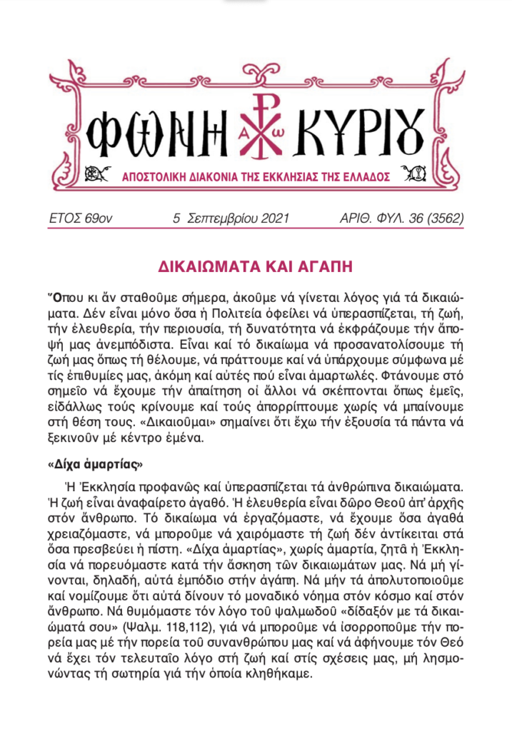 ΔΙΑΒΑΣΤΕ ΔΙΑΔΙΚΤΥΑΚΑ την “Φωνή Κυρίου” της Αποστολικής Διακονίας της Εκκλησίας της Ελλάδος, της Κυριακής ΙΑ´ Ματθαίου, 5 Σεπτεμβρίου 2021, όπως αυτή διεμοιράσθη σε όλους τους ιερούς ναούς της ελληνικής επικράτειας, αλλά και του εξωτερικού.
