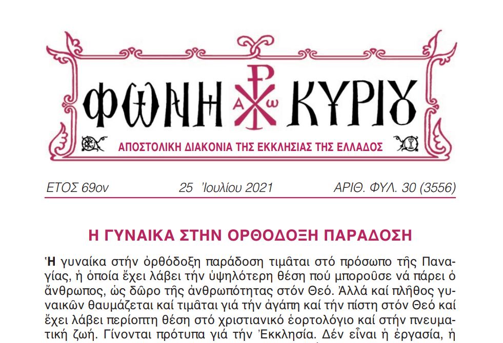 Εκκλησία της Ελλάδος 25 Ιουλίου, 2021 Φωνή Κυρίου: Η Γυναίκα στην Ορθόδοξη Παράδοση Διαδώστε: ΔΙΑΒΑΣΤΕ ΔΙΑΔΙΚΤΥΑΚΑ τη Φωνή Κυρίου της Αποστολικής Διακονίας της Εκκλησίας της Ελλάδος – ΚΥΡΙΑΚΗ Ε’ ΜΑΤΘΑΙΟΥ – όπως αυτή διεμοιράσθη σε όλους τους ιερούς ναούς της ελληνικής επικράτειας, αλλά και του εξωτερικού, κατά την 25η Ιουλίου 2020. Διαδώστε: