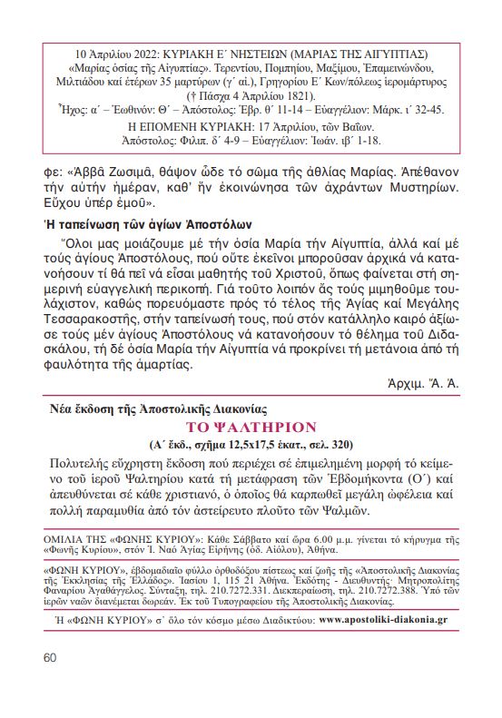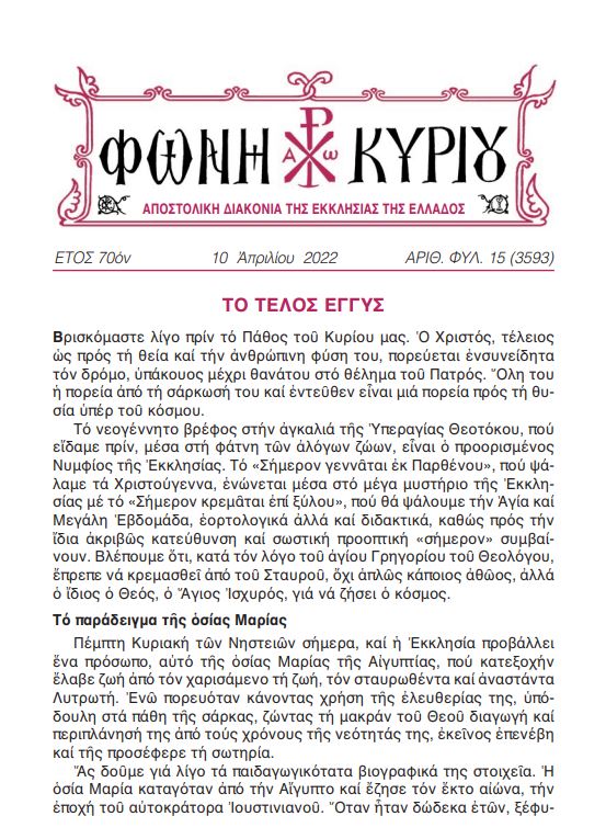 ΔΙΑΒΑΣΤΕ ΔΙΑΔΙΚΤΥΑΚΑ την «Φωνή Κυρίου» της Αποστολικής Διακονίας της Εκκλησίας της Ελλάδος, της Κυριακής Ε’ Νηστειών (Μαρίας της Αιγυπτίας), 10 Απριλίου 2022, όπως αυτή διανεμήθηκε σε όλους τους ιερούς ναούς της ελληνικής επικράτειας, αλλά και του εξωτερικού.