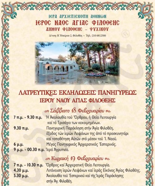 Οι λατρευτικές εκδηλώσεις ξεκινούν σήμερα Σάββατο 18 Φεβρουαρίου και κορυφώνονται με τη λιτάνευση των ιερών λειψάνων και της ιεράς εικόνας της Αγίας Φιλοθέης στις 16:30 το απόγευμα της Κυριακής 19 Φεβρουαρίου.