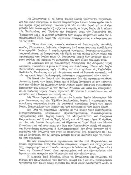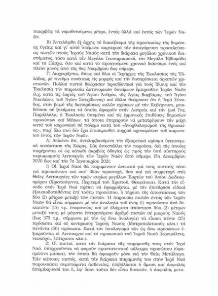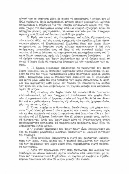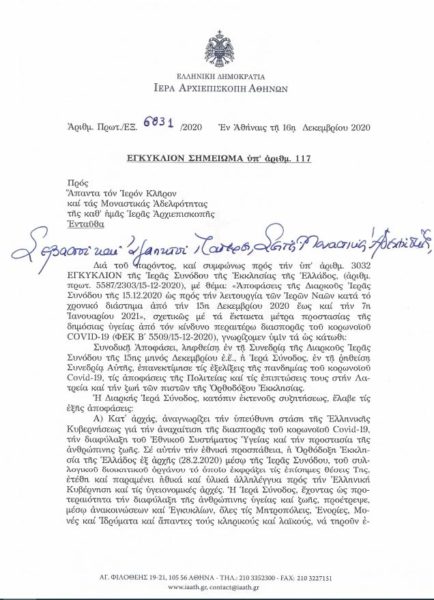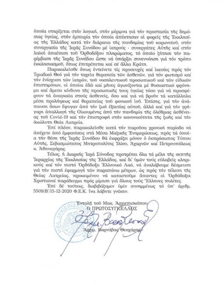 16/12/2020 16/12/2020 Εγκύκλιο Σημείωμα απέστειλε η Ιερά Αρχιεπισκοπή Αθηνών σε όλους τους Ιερούς Ναούς ώστε να τηρήσουν τα μέτρα, σύμφωνα με τις αποφάσεις που έλαβε η Διαρκής Ιερά Σύνοδος, που ολοκληρώθηκε σήμερα. Μαζί με την Εγκύκλιο αποστέλλουν και τη σχετική ΚΥΑ που δημοσιεύτηκε εχτές για τα μέτρα που θα ισχύουν σε όλους τους χώρους λατρείας μέχρι 7...