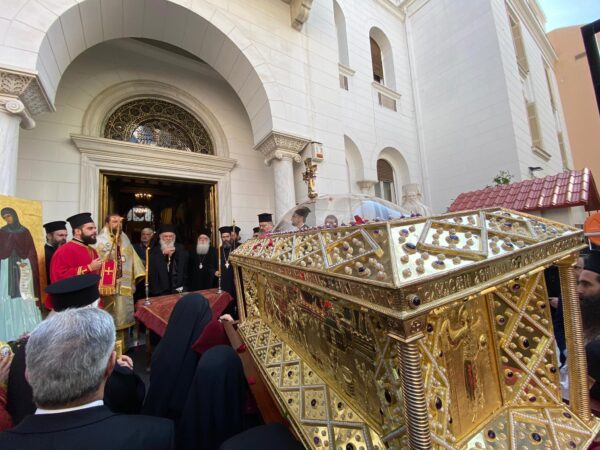 Το ιερό σκήνωμα διήλθε από το σπίτι της Αγίας και την Αρχιεπισκοπή Αθηνών, όπου έγινε δέηση παρόντος του Αρχιεπισκόπου Αθηνών και Πάσης Ελλάδος κ.κ. Ιερωνύμου.