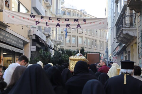 Με κωδωνοκρουσίες και με την συμμετοχή πλήθος κόσμου έγινε η λιτάνευση της ιεράς εικόνος και του σκηνώματος της Αγίας Φιλοθέης που μετέφεραν μοναχές από τα μοναστήρια του Καρέα.