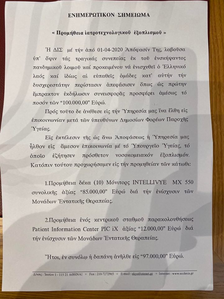 Την ενίσχυση του Εθνικού Συστήματος Υγείας με το ποσό των 100.000 ευρώ είχε αποφασίσει η Διαρκής Ιερά Σύνοδος, κατά την συνεδρίαση της 1ης Απριλίου. Κατόπιν αυτού και μετά από συνεννόηση με το υπουργείο Υγείας προχώρησε στην προμήθεια δέκα μόνιτορς για τον εξοπλισμό των Μονάδων Εντατικής Θεραπείας, αξίας 85.000 ευρώ και ενός κεντρικού σταθμού παρακολούθησης επίσης για τις ΜΕΘ αξίας 12 χιλιάδων ευρώ.