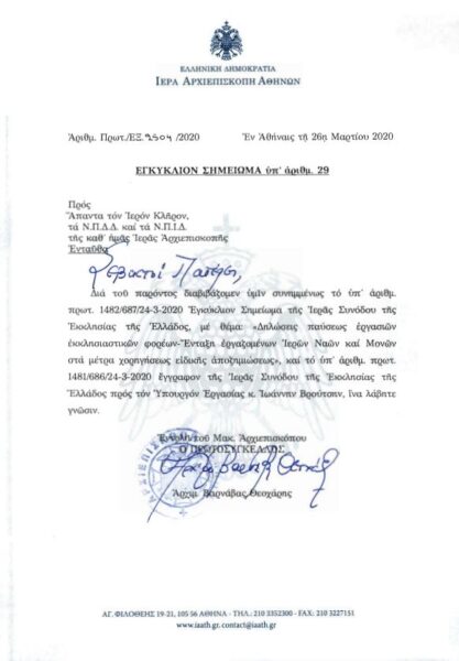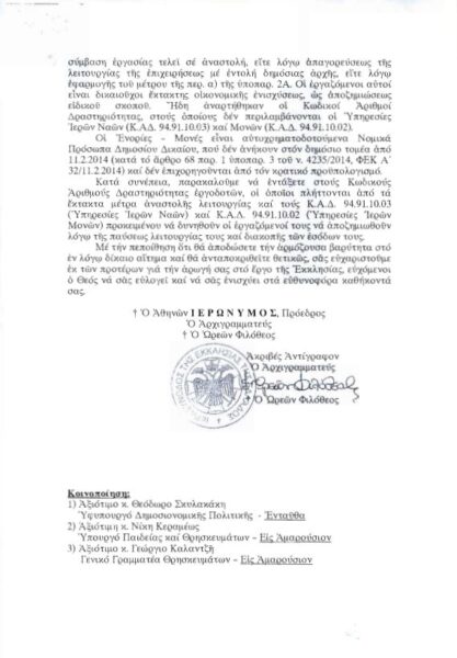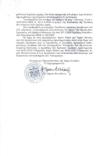 Η Ιερά Σύνοδος άλλωστε απέστειλε σχετικό έγγραφο προς τον Υπουργό Εργασίας κ. Ιωάννη Βρούτση, ενημέρωνοντας τον ιερόν κλήρο και κάθε ενδιαφερόμενο περί των ενεργειών της.