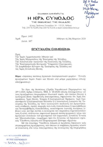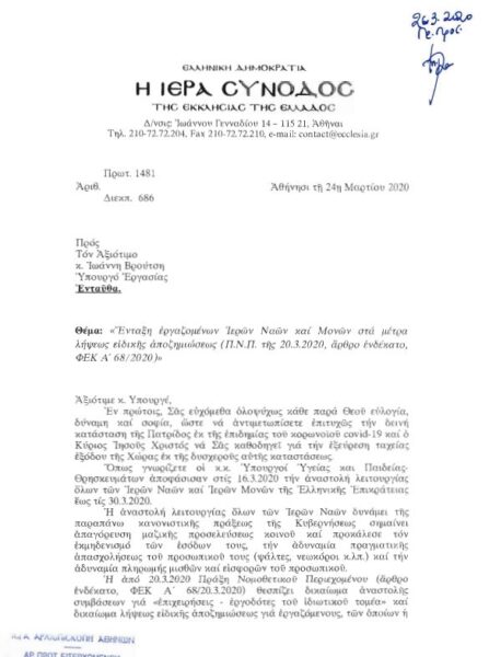 Η Ιερά Σύνοδος άλλωστε απέστειλε σχετικό έγγραφο προς τον Υπουργό Εργασίας κ. Ιωάννη Βρούτση, ενημέρωνοντας τον ιερόν κλήρο και κάθε ενδιαφερόμενο περί των ενεργειών της.