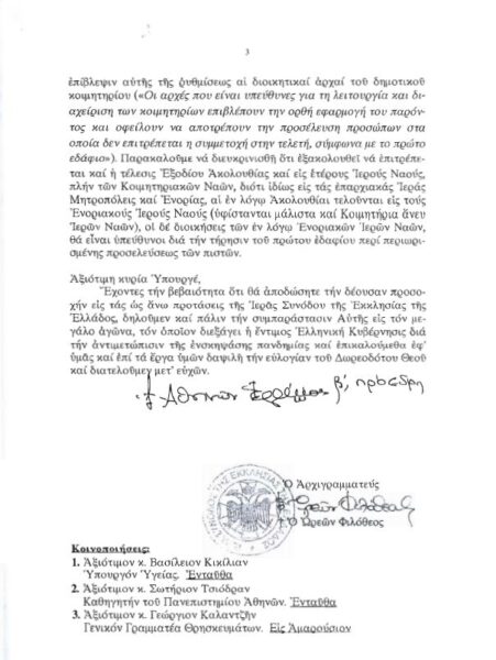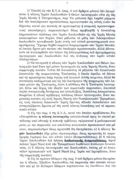 Στην εν λόγω Επιστολή ζητά την απρόσκοπτη τέλεση ιερών Ακολουθιών στις Ιερές Μονές κεκλεισμένων των θυρών, καθώς και την τέλεση Θ. Λειτουργιών και Ακολουθιών εις τους ιερούς ναούς με έναν μόνον Λειτουργό και άνευ συμμετοχής πιστών.