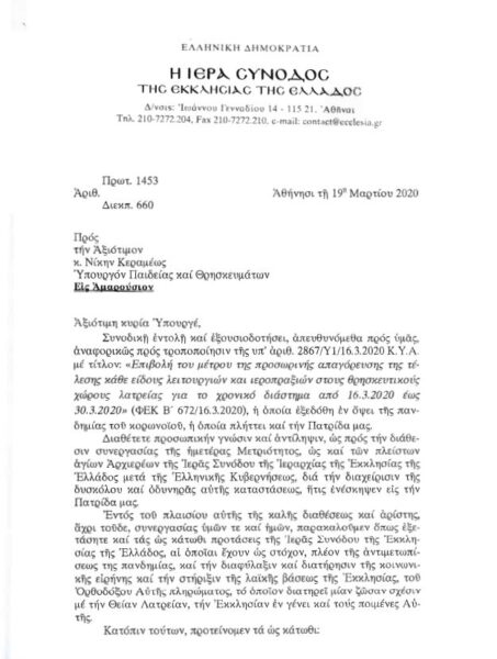 Παραθέτουμε την Επιστολή της 19ης Μαρτίου 2020: