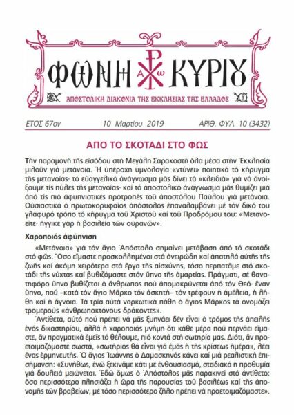 Διαβάστε ΕΔΩ τη “ΦΩΝΗ ΚΥΡΙΟΥ” της Αποστολικής Διακονίας της Εκκλησίας της Ελλάδος, όπως αυτή διαμοιράστηκε στους ναούς ολόκληρης της χώρας, κατά την Κυριακή 10 Μαρτίου 2019.