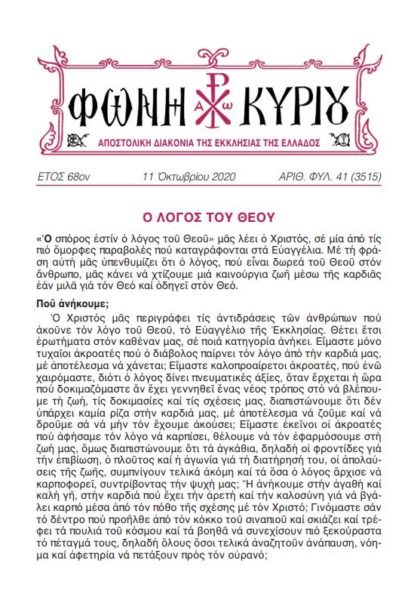 ΔΙΑΒΑΣΤΕ ΔΙΑΔΙΚΤΥΑΚΑ τη “Φωνή Κυρίου” της Αποστολικής Διακονίας της Εκκλησίας της Ελλάδος – ΚΥΡΙΑΚΗ Δ’ ΛΟΥΚΑ – όπως αυτή διεμοιράσθη σε όλους τους ιερούς ναούς της ελληνικής επικράτειας, αλλά και του εξωτερικού, κατά την 11η Οκτωβρίου 2020.